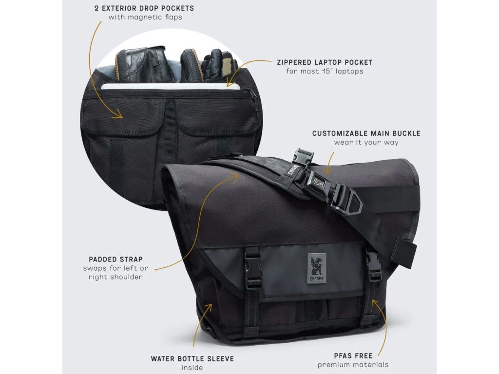 Stylová a pohodlná brašna Chrome Messenger s objemem 15 l má ergonomicky tvarovaný ramenní popruh se stabilizačním bočním páskem, díky kterému drží pevně na svém místě i když šlapete do pedálů ze všech sil. Brašna má integrovanou kapsu na notebook a spoustu praktických vychytávek.