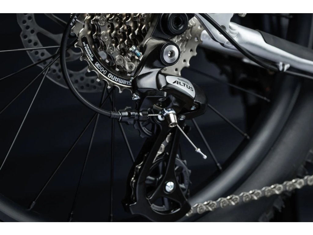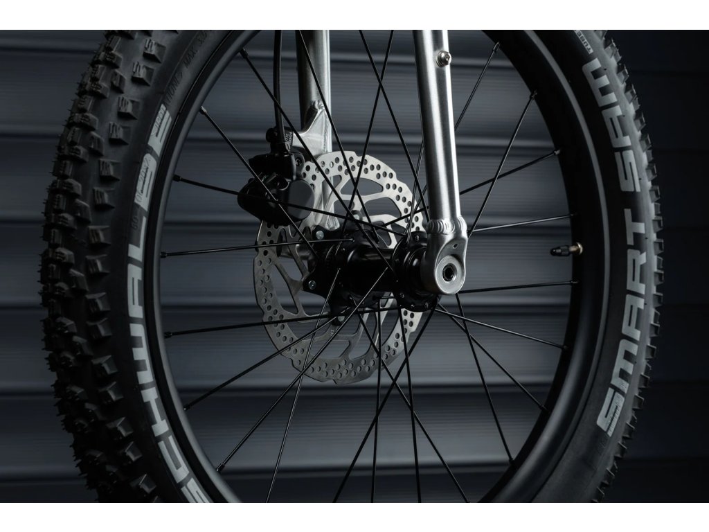 8rychlostní pohon Shimano s krátkými 110mm klikami zajišťuje plynulé a efektivní šlapání. Hydraulické brzdy Tektro 160 mm, kola s utěsněnými ložisky a pevnými osami a pláště Schwalbe Smart Sam 2,3" dávají jistotu a kontrolu i v náročném terénu.