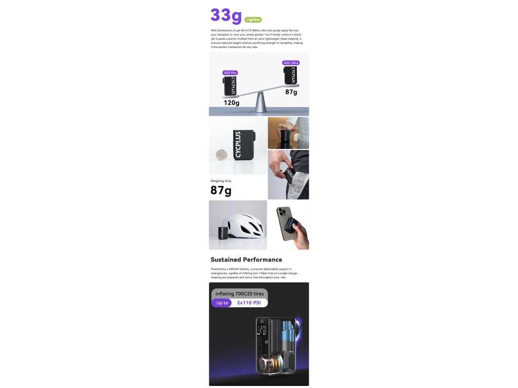 Cycplus AS2 Ultra je ultralehká elektrická pumpa nové generace, která je nyní o 33 g lehčí než její předchůdce. Díky kompaktním rozměrům se bez problému vejde do kapsy, podsedlové brašny či batohu a stane se tak praktickým a spolehlivým společníkem na každé vyjížďce.