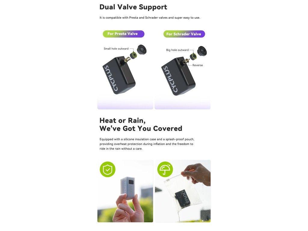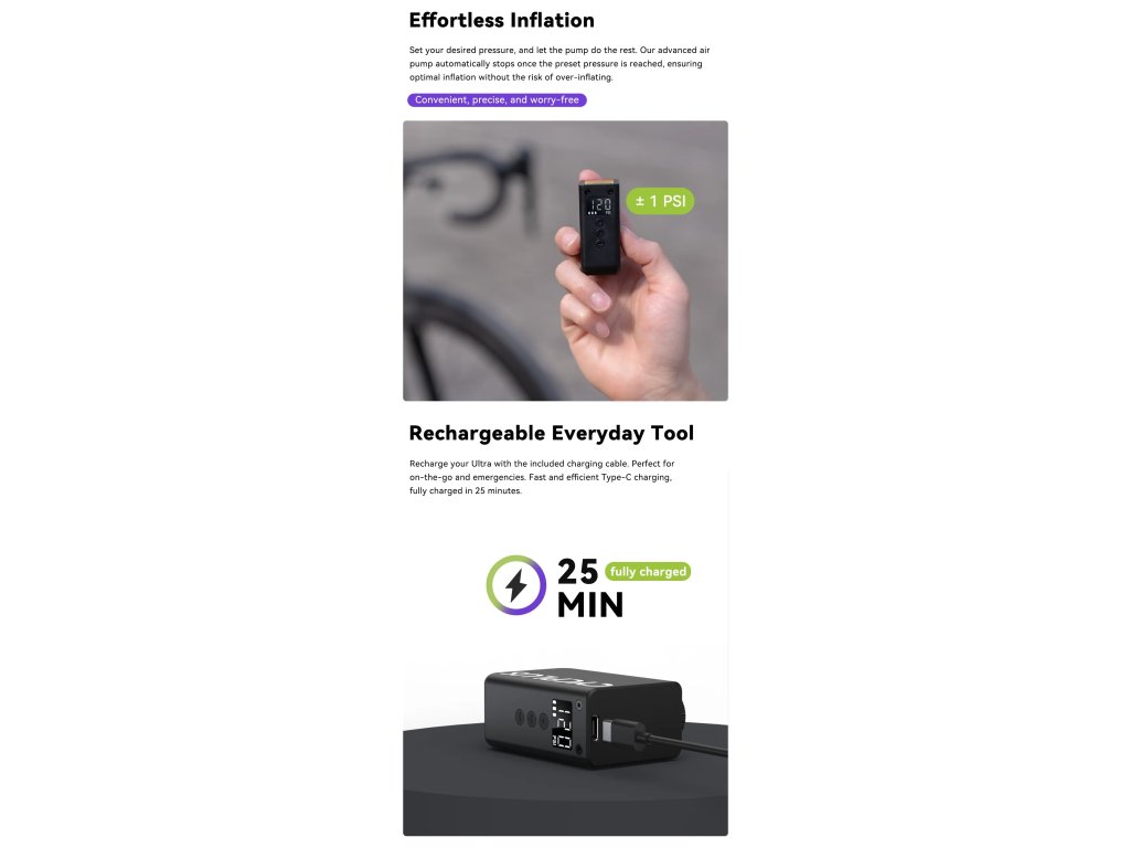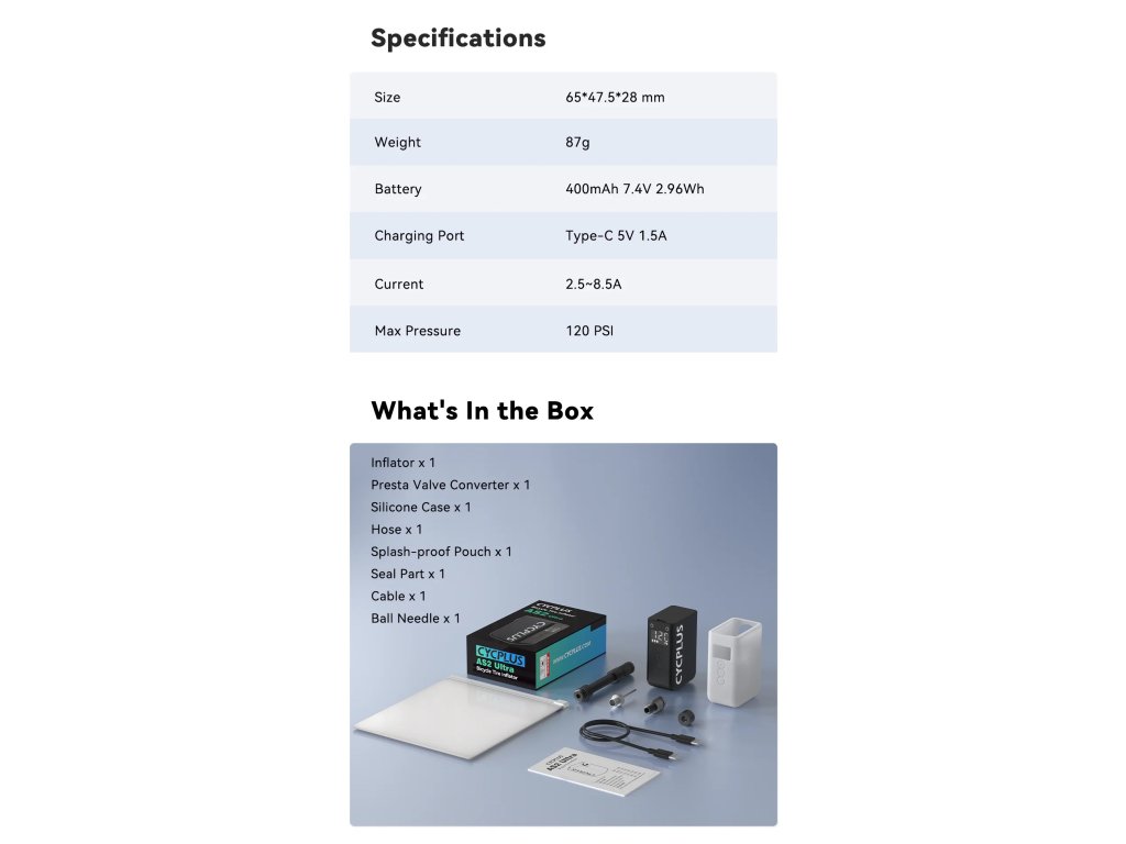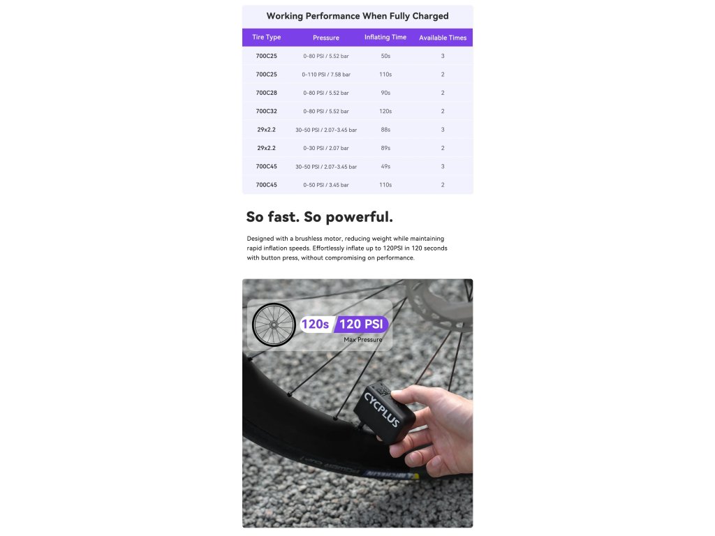Tato pumpa zcela nahradí vaši starou pumpu nebo CO₂ bombičky. Díky technologii Cycplus a bezkartáčovému motoru dokáže pumpa nahustit pláště až na 8,2 baru. Na jedno nabití můžete nahustit až čtyři pneumatiky na 5 barů.