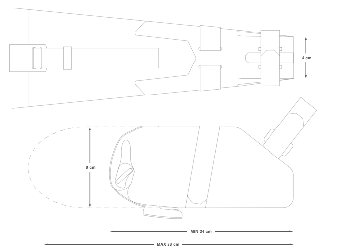 - Uchycení: 3bodový systém s dvěma zesílenými suchými zipy vyztuženými Hypalonem (lišty sedla a sedlovka) a silikonovou rukojetí sedlovky