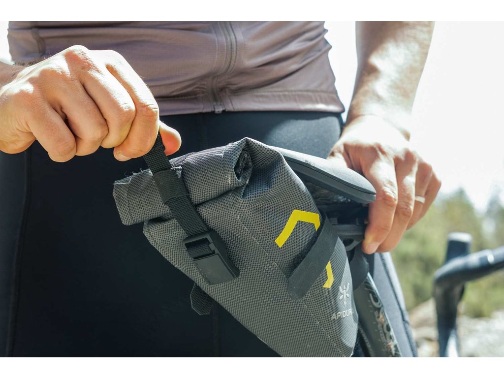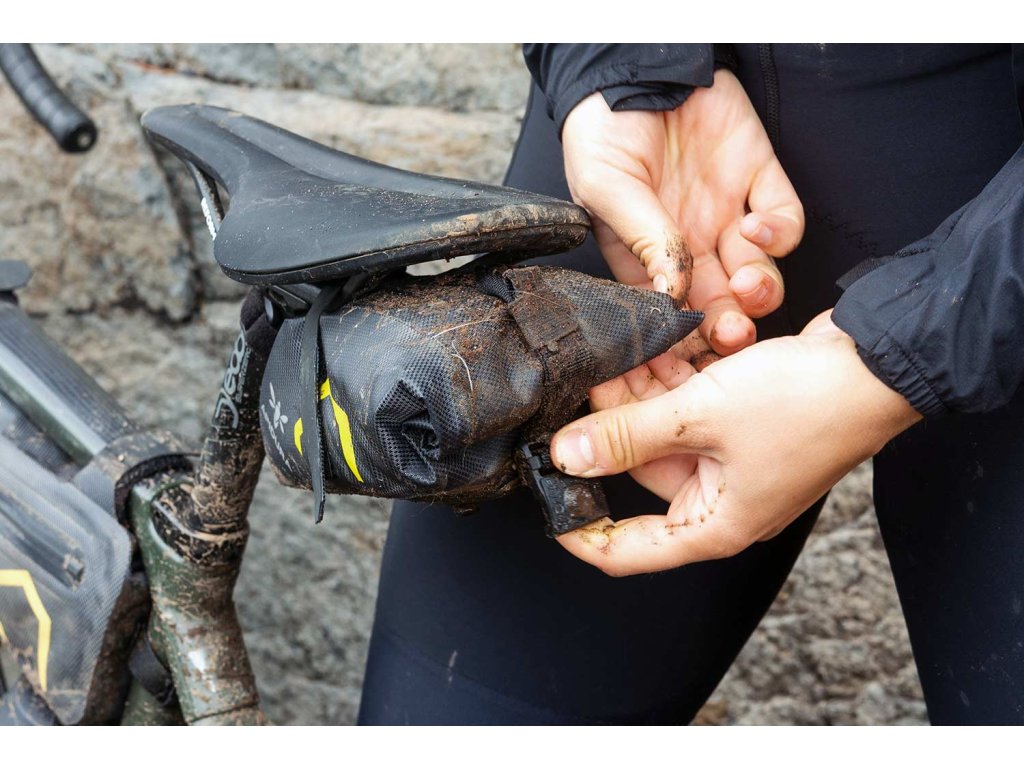 Voděodolná a ultralehká brašna Apidura o objemu 1 l s bezpečným magnetickým zapínáním Fidlock a rolovacím uzávěrem pohodlně pojme dvě duše i sadu nářadí. Díky svařované vodotěsné konstrukci máš jistotu, že obsah zůstane v suchu za každého počasí, ať vyrazíš na krátkou vyjížďku nebo vícedenní dobrodružství.