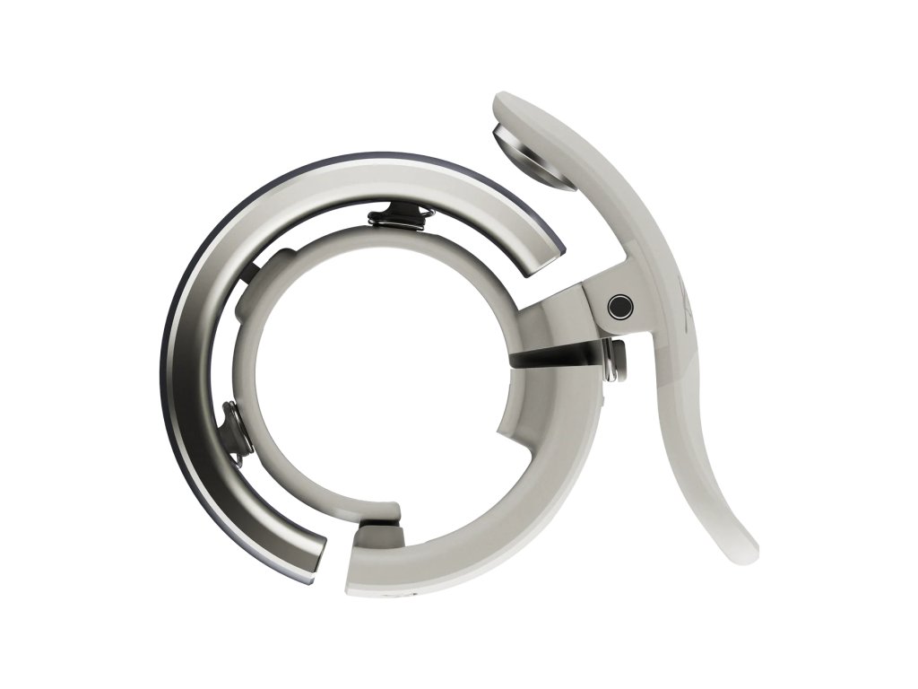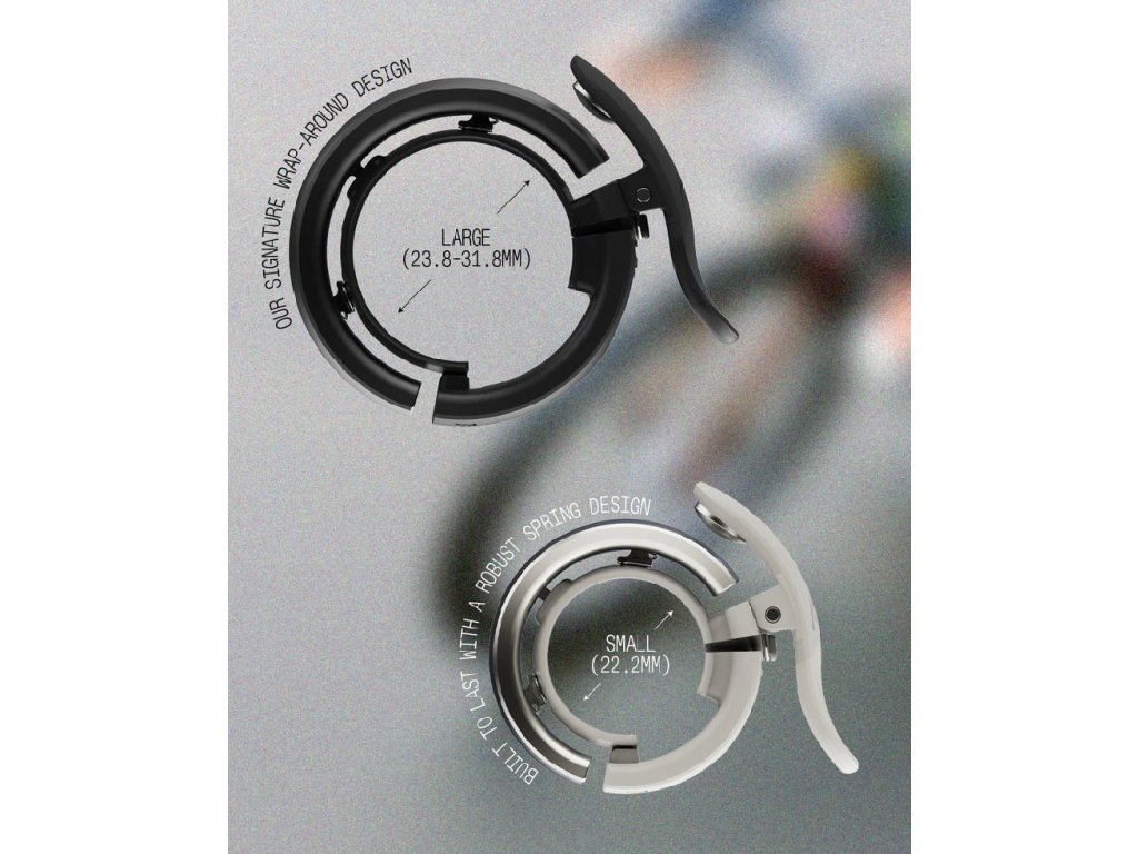 Zvonek je dostupný ve dvou velikostech, aby perfektně seděl na různých průměrech řídítek. Zvonek Knog Prima pro menší průměr řídítek najdete tady.